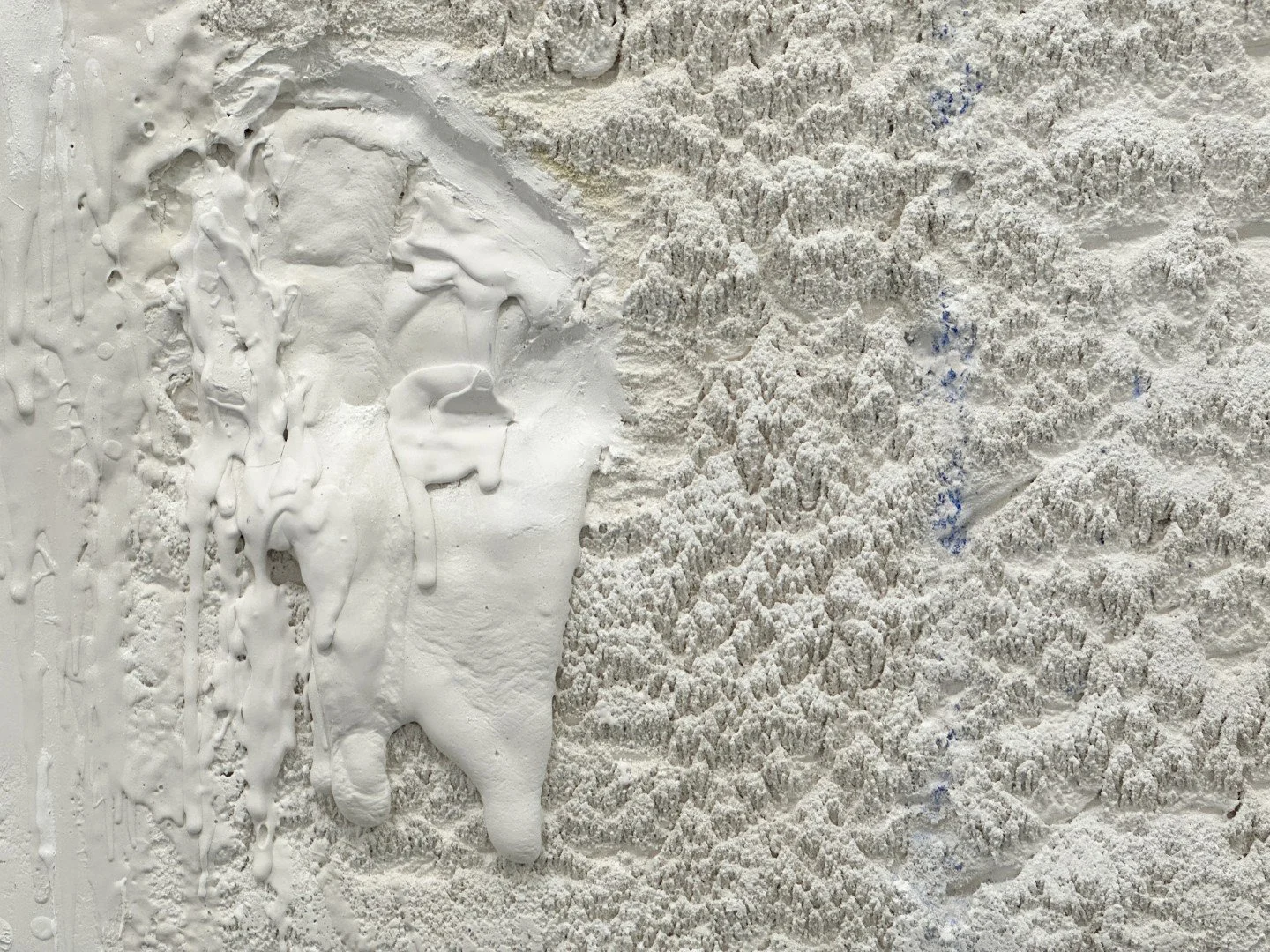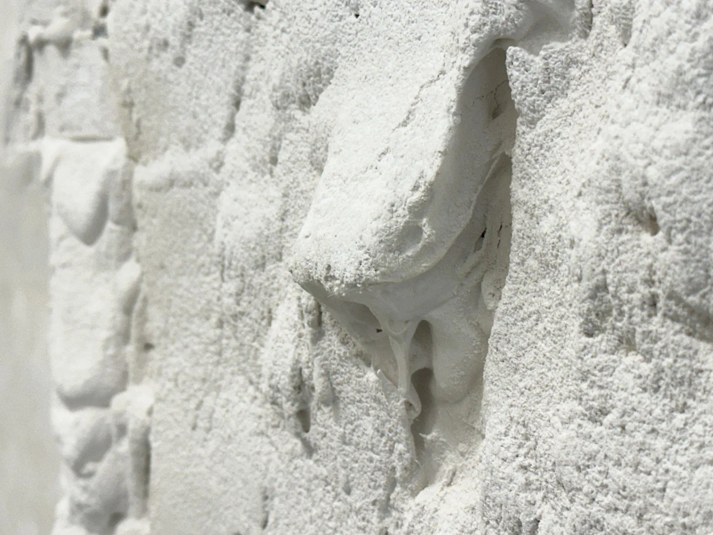 About the Emplacement exhibition, Jill Downen states: "Drawing is the first form of expressivity, before verbal acquisition, to reach out and touch a surface in a way that leaves a mark. Drawing is the main artery that runs through my life’s work: the immediacy of thought, to make sensations and ideas visible. Drawing with plaster fits my sensibilities and physicality. After years of drawing with plaster on various grounds, including paper, I arrived at the conclusion that the plaster needed an architectural substrate. Wood lath brings the skeletal support and conceptual framework in a unified form. These materials allow me to erase with chisels and grinders, building up the surface and then taking it back down to the bones cyclically until the piece is resolved."