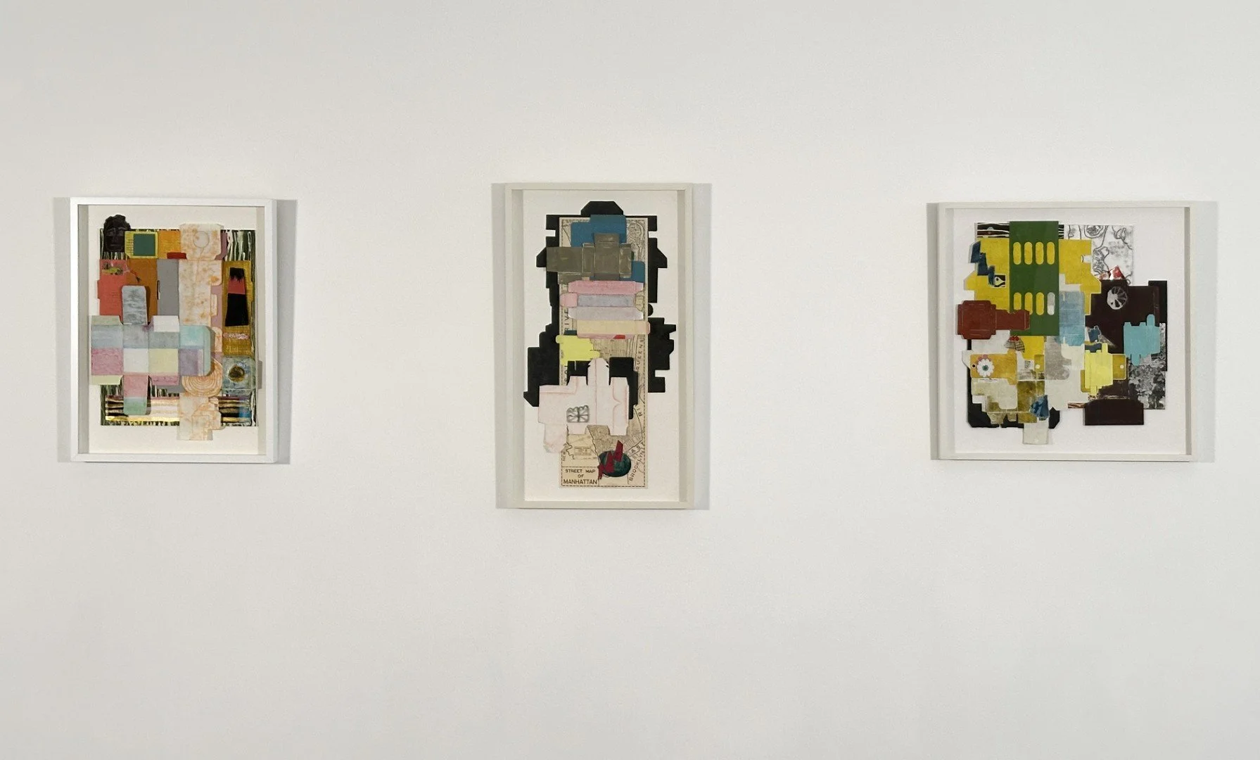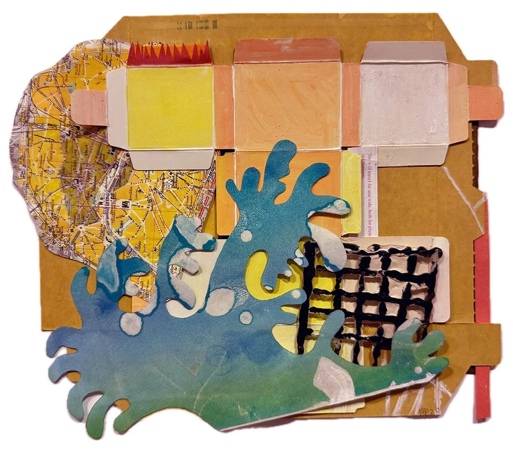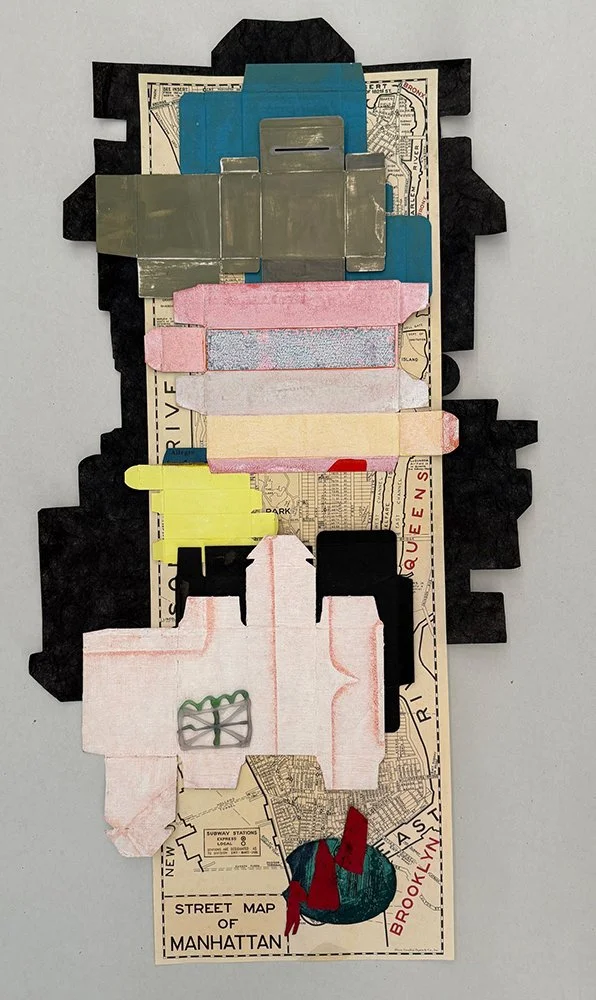 Born of the interplay between solitary work in her studio, the push-pull of her personal life, and the ongoing turmoil of the outside world, Dubinsky’s new work builds on her earlier work and combines maps and silhouetted figures with abstract shapes created by flattened and printed boxes. Using painting, printmaking, alternative photography, and collage she incorporates earlier, never shown or salvaged work and frames.