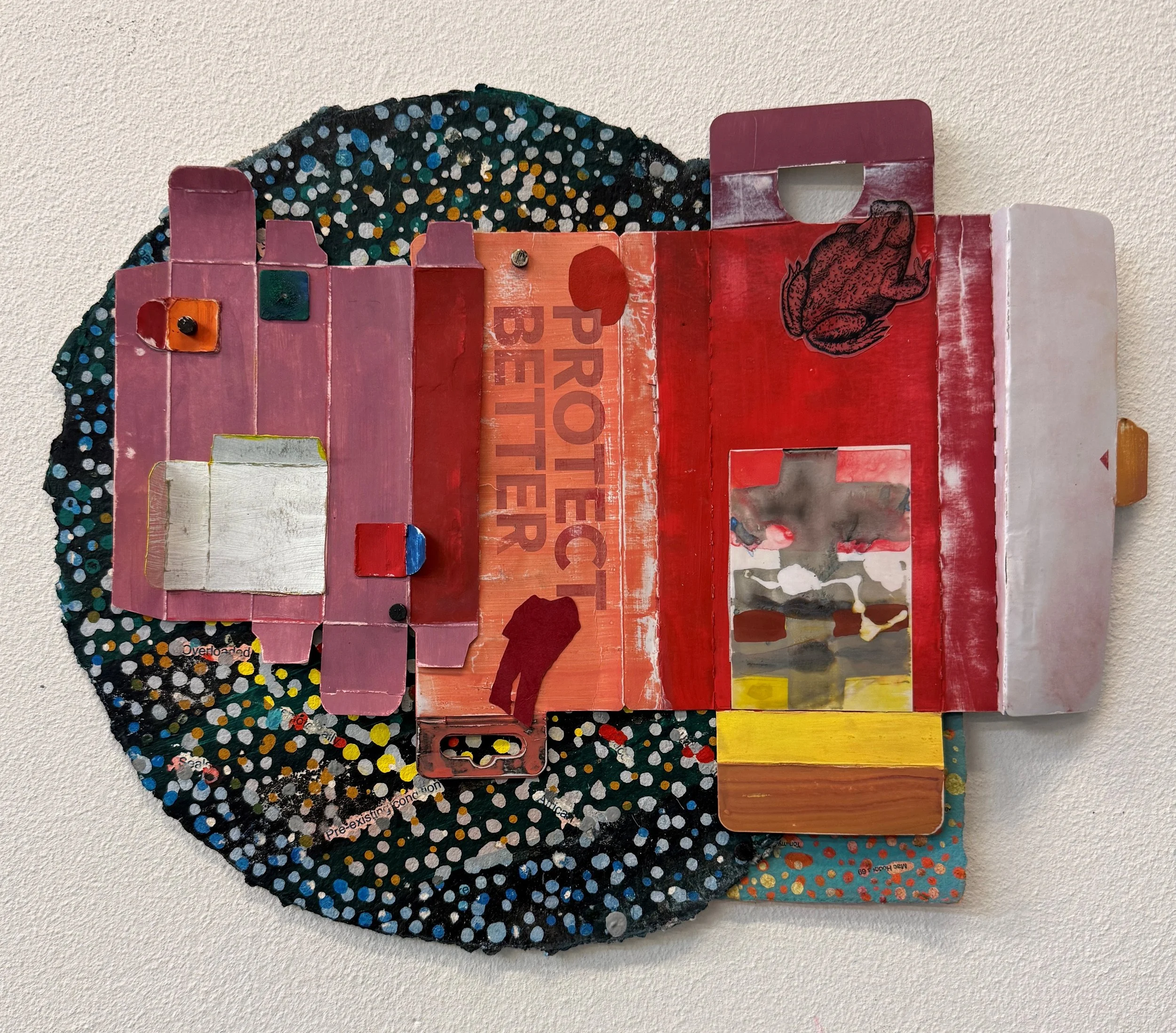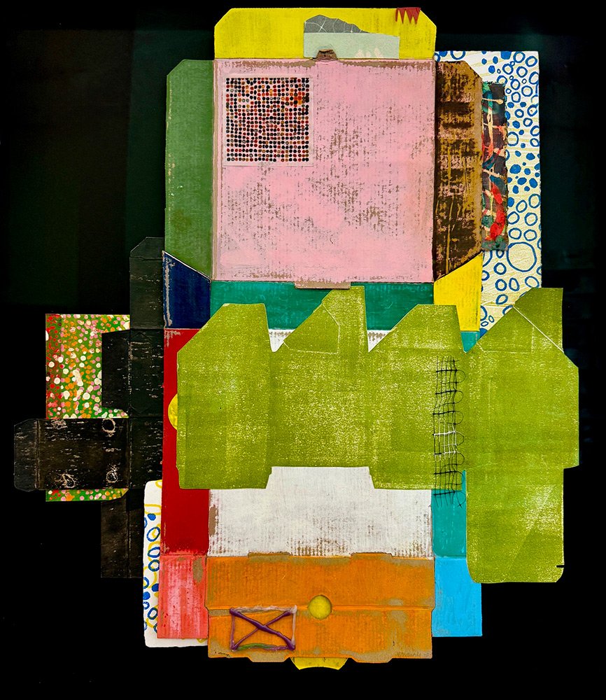 Redipped 2025 Gesso, ink, woodcut, hot glue on various papers, boxes, acetate 11.0 H x 11.0 W inches (paper size) 14.75 H x 14.5 W inches (frame size)