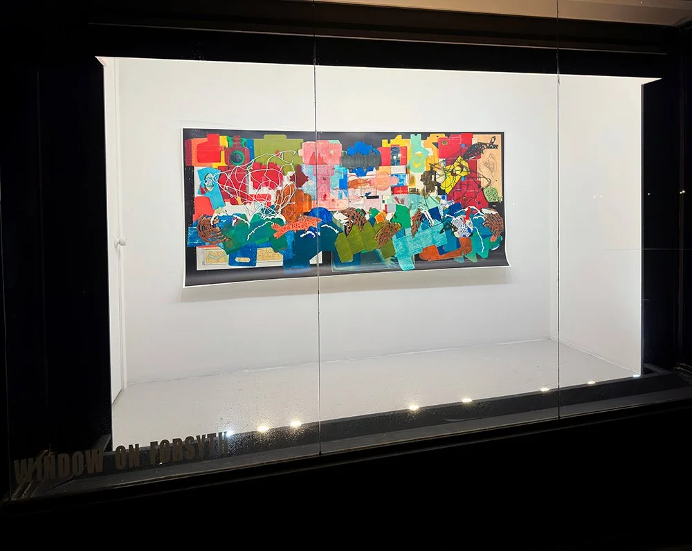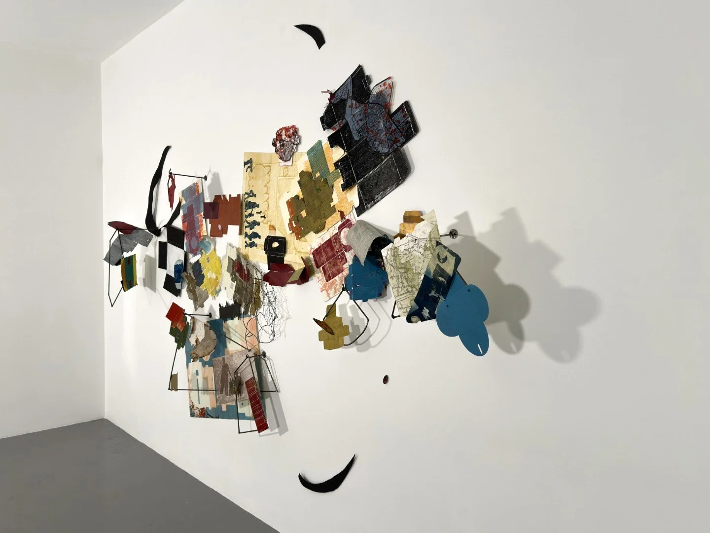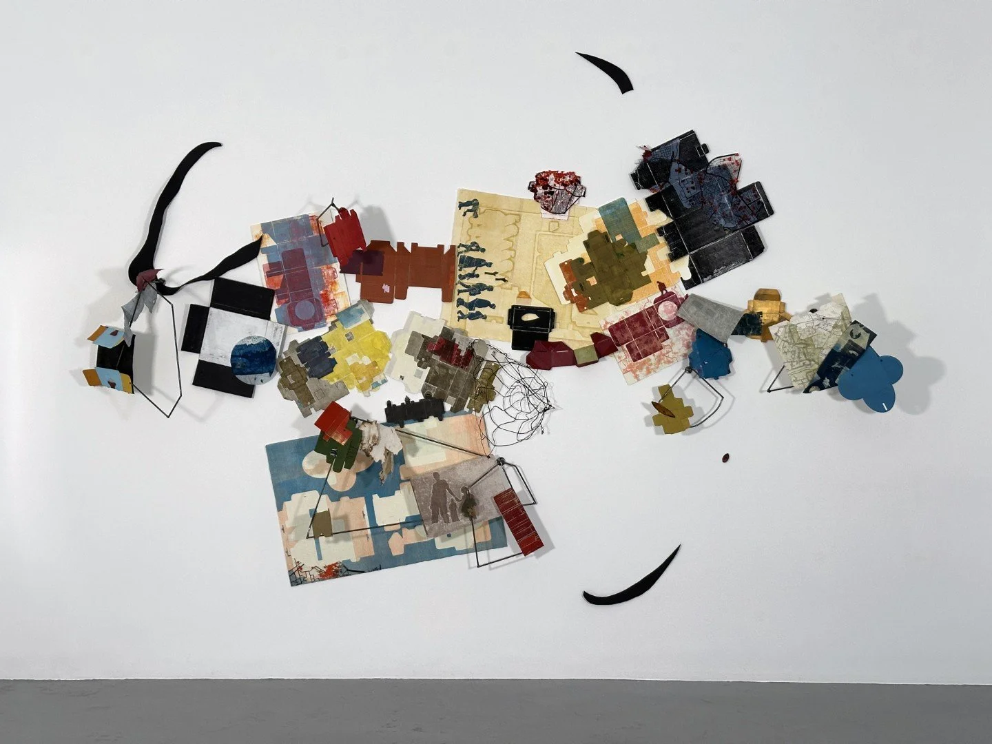 In her last St. Louis exhibition at Bruno David Gallery, Dubinsky repurposed small cardboard boxes used to store medicines and art supplies. She then flattened, printed, or painted on them, and transformed them into discrete two-dimensional objects. She later, in her most recent exhibition (2024 in New York) pushed the boxes further, using them as printing plates, layering their shapes on paper to create complex monotypes. The resulting prints were brought together with the original boxes, which had been printed, painted, and collaged using oil-based ink, gesso, colored inks, photo processes, acrylic, pencil, and marker to create large-scale, three-dimensional installations, as well as smaller works. One of those installations is reconstructed in this exhibition. The boxes in earlier work gestured toward their original use, as containers for supplies—medical and artistic—that sustain an individual life. But here, as they alchemize into sprawling assemblages and collages, they begin to resemble buildings and intersecting realities. The arrangement of the boxes and prints in the large installation Deconstruct (2024) is deliberately chaotic. Intermingling with hand-welded metal shapes, the boxes appear to randomly come off the wall, reflecting a landscape that might have been bombed or destroyed by natural disasters. Also printed on the boxes are maps from places such as Aleppo, Kiev, and Gaza, as well as silhouetted figures drawn from newspaper articles and photographs of Dubinsky’s own family. In all the work these figures travel, as if on a journey to someplace new. Maps of sanctuary cities appear too. In Deconstruct, the travelers survey the rubble, perhaps forced to flee homes now destroyed..